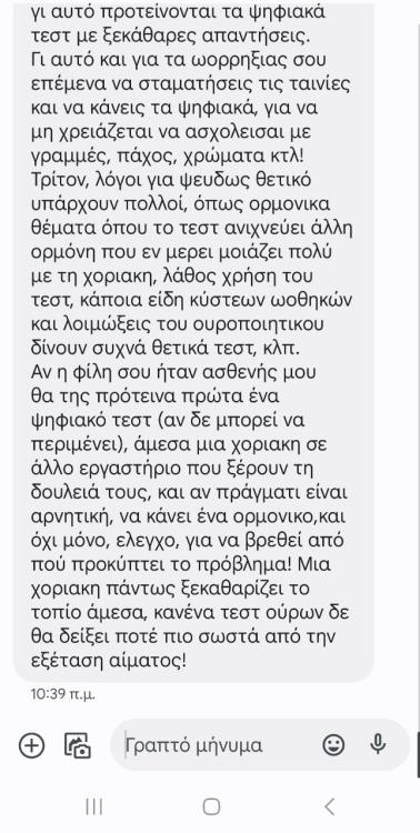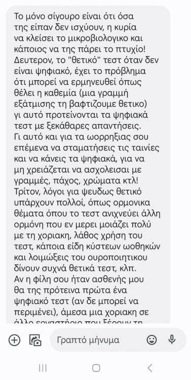 Kαλημέρα κορίτσια!!! Ρε σεις σας ζηλεύω, τι παχιές γραμμές, τι ροζ, εγώ τίποτα, με πολύ ζόρι εξακολουθώ να βλέπω μόνο σκιά, χωρίς χρώμα, γκρι θα το έλεγα. Πόσο πρέπει να εκπαιδευτώ πχια; Να δείτε που όοοοοοταν θα έχω εγώ θετικά, θα τα βαφτίζω αρνητικά και με καθυστέρηση 34214949 μέρες θα περιμένω περίοδο! 😅😅😅 @marinamanoulitsa γιατί δεν πας σε άλλο μικροβιολογικό για 2ο τσεκάρισμα;; εγώ στα τεστ που έχω διάβασα χτες ότι ανιχνεύει χοριακή από 10 και πάνω, δηλ με ποια λογική λέει η άλλη ότι στο αίμα δε φαίνεται ακόμα, που ανιχνεύει από 0 και πάνω; Αν είσαι χαλαρή και ήρεμη οκ αλλά αν τρώγεσαι, είναι πολλές οι μέρες κορίτσι μου μέχρι τη Δευτέρα, και σιγά τον κόπο, ένα τσίμπημα, 10 ευρώ και μισή μέρα αναμονή! Αν βγει θετική η χοριακή θα ξέρεις αρκετά νωρίς και θα κανονίσεις κ με το γιατρό σου πώς πρέπει να προχωρήσεις, αν βγει αρνητική δε θα περάσεις ένα ΠΣΚ τρώγοντας τα νύχια σου, τα σωθικά σου και τα μάτια σου σε τεστ!! Δεν ξέρω, μια γνώμη λέω, μπορεί να ναι και λάθος, αλλά κρίνοντας από το άγχος που έχω εγώ για σένα πριν κοιμηθώ και με το που ξυπνήσω, φαντάζομαι πώς θα είσαι εσύ!! @dimand το μεσημέρι θα έχουμε αποτελέσματα λογικά;;; άντε πες τους να κάνουν πιο γρήγορα, καρδιακές γίναμε! Ωστόσο δεν έβαλες φωτό και δεν πρέπει να σου μιλάω. Εγώ είμαι εκπαιδευόμενη ακόμα, χρειάζομαι πρακτική. -