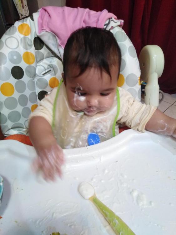 Έβαλα μια μικρη ποσοτητα σε ενα μπωλακι κ πηρα 2 κουταλακια(1 σιλικονι κ 1 πλαστικό) που ειχα στον γιο μου κ της εβαζα γιαουρτι κ το αφηνα μπροστα της. Ειναι μικρή πολυ για προγεμισμενα αλλα δεν τα παράτησε, έφαγε τα 3/4 του γιαουρτιου. Καποιες φορες το επιανε καλα κ το εβαζε στο στομα κ οταν δεν το επιανε καλα της επεφτε στον δίσκο εκνευριζοταν κ πασαλειβε το προσωπο της. Την επομενη θα της βαλω κατι μεσα στο γιαουρτι να την δω. Απλα δεν θα της δωσω ξανα το λεπτο κουταλι σιλικονης γιατι φευγει η ποσότητα, ισως δωσω δικο μας.