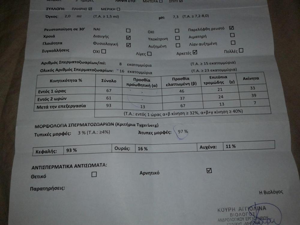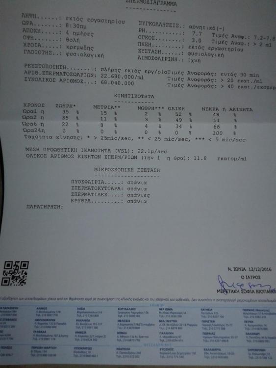 Δε γίνεται να ειναι λάθος το προηγουμενο επειδή έχουμε κάνει και άλλα και δεν είναι καλά.. Επίσης το προηγούμενο το κάναμε δυο μήνες πριν στο λυμπεροπουλο που έχει εργαστήριο σπερμοδθαγραμματος κ ασχολείται αποκλειστικά και μόνο με αυτό.... Με τίποτα άλλο.. Ούτε καν ανάλυση αίματος δεν κάνει... Επίσης το πρόβλημα του άντρα μου οφειλόταν σε τεραστια κιρσοκηλη, η οποία βέβαια τώρα αφαιρέθηκε αλλά η ζημιά έχει γίνει... -