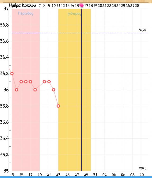 Βλέπεις καθολου σημάδια της καταραμμενης;; Εμένα μου ήρθε κορίτσια σήμερα το πρωί.....έλεος πια!!! Κορίτσια μήπως η ωχρινικη μου φάση είναι μικρη;;; Ρίξτε μια ματιά στα θερμοδιαγραμματα των 2 κύκλων μου.....πείτε μου απόψεις....νομίζω κάτι παίζει..! -
