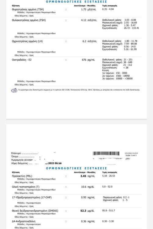 Καλημέρα κορίτσια μου αυτές τις μέρες έχω φουλ πίεση στο γραφείο και δεν προλαβαίνω να σας διαβάσω. Πήγα σήμερα το πρωί και έκανα κι άλλες ορμονολογικες που δεν της ξέρω καθόλου. Μου έβαλε Testo,tsh,ανδροστενεδιονη,17-OHPRG,DHEA-S και κάτι άλλες γενικές. Και φυσικά να επαναλάβω E2 LH FSH κλπ. Κάθομαι σε αναμμένα κάρβουνα μέχρι να βγουν τα αποτελέσματα.