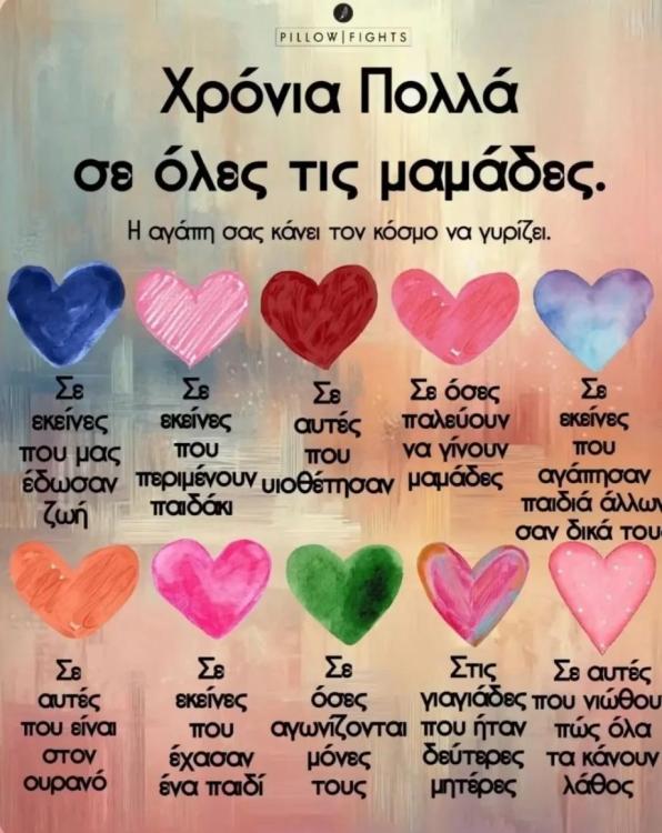 Καλημέρα κορίτσια!!! Χρόνια πολλά σε όλες τις μανούλες σε όσες έχουν τα παιδάκια τους, σε όσες τα περιμένουν, σε όσες τα έχουν χάσει αλλά δεν το βάζουν κάτω και ελπίζουν και σε όσες προσπαθούν να γίνουν μανουλες ... Ο Θεός να μας έχει καλά να μας δίνει πίστη ελπίδα κ δύναμη γιατί μάνα είναι βράχος και οτι πιο ιερό στον κόσμο!!!! -