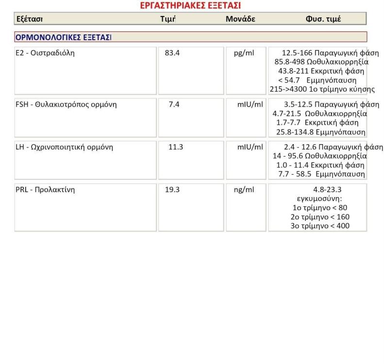 Κορίτσια τα φωτα σας οσες εχουν ιδέα. .. Πρώτη φορά έκανα όλες αυτές τις ορμονικές εξετάσεις 4η μερα κυκλου. Σε προηγούμενο κυκλο είχα κανει FSH που ήταν γύρω στο 8 και κάτι. Και TSH που ρύθμισα λόγο χασιμοτο στο 2,3 πηγε με χαπι. Την Παρασκευή θα πάω σε Γυναικολόγο υπογονιμοτητας και για σαλπιγγογραφια. Η Γυναικολόγος μου ενώ της έλεγα αν θα κάνω άλλες εξετάσεις 3η Μερα κυκλου μου έλεγε δεν χρειάζεται αφού είναι καλή η FSH θα το δούμε αργότερα. Εγώ πήγα σήμερα τις έκανα μόνη για να έχω να δείξω όσο περισσότερα από εξετάσεις μας στον εξειδικευμενο γιατρό γονιμότητας.